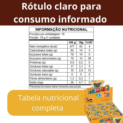Cada pote contém 18 g de confeitos sabor chocolate.