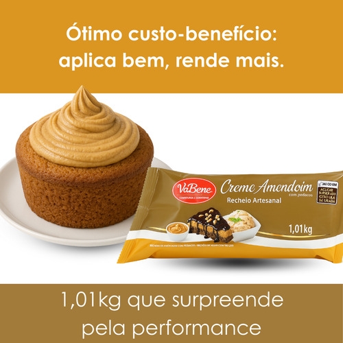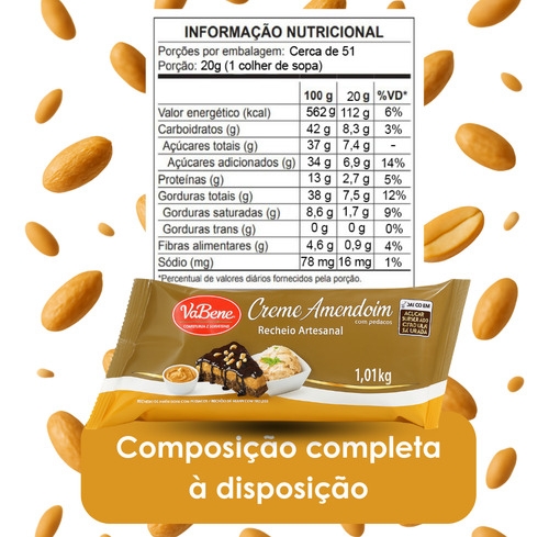 Recheio artesanal com pedaços crocantes de amendoim, textura cremosa e sabor autêntico: o Creme de Amendoim VaBene é ideal para confeitarias e sobremesas gourmet. Pronto para uso direto, com alto rendimento e embalagem prática de 1,01 kg.
